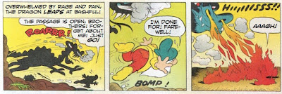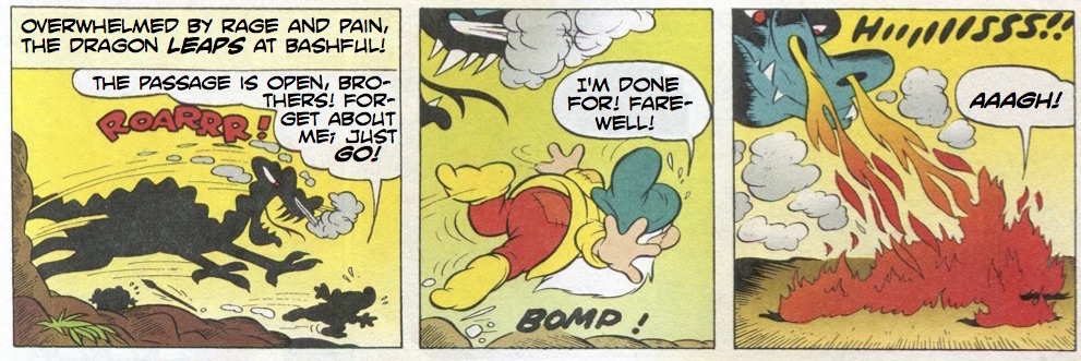 So that's good for discipline, I guess. BUT, it must be said: as much as I like the movie, the fact is, the dwarfs do not talk that much, and to the extent that they do, it's impossible to glean much of an idea of how they'd speak in an adventure scenario like this one. This is somewhat less the case for Grumpy and Doc, but only somewhat, and you will note, in any case, that those two are the first and second to be eliminated from contention. So...it's pretty tough to do much in the dialogue to characterize them, particularly since it's ofttimes impossible to tell which dwarf a given speech balloon is supposed to come from. So...there's undeniably a certainly loss of fidelity to the original story in terms of character. Note particularly that at no point does Bashful appear notably bashful (least of all when he's just attacking the shit out of a dragon).