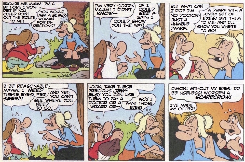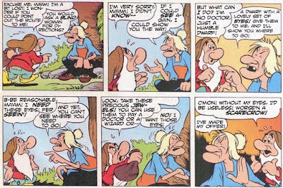 Yes, the main word I would use to characterize "The Seven Dwarfs and the Enchanted Faerie" is "dumbfounding," and oh come on you know where this is going. Download my English version here (my eleventh translation! Whaddaya know about that?).  I sure as heck didn't expect to be translating a Seven Dwarfs story, of all things, but needs must.  I know I may possibly have suggested that I was giving up that little hobby as long as IDW was around, but what can I say? Sometimes you read a story and think "this really, really needs to be in English, and if I don't take things into my own hands, it is never, ever going to be." I am super damn psyched to be able to share this with all y'all.