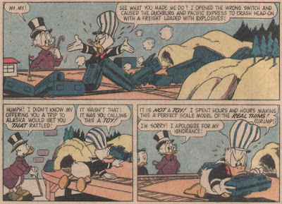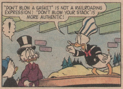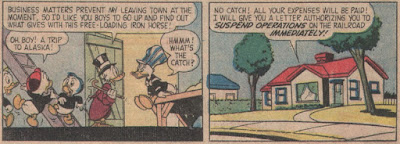 This is one of my favorite old-time Carl Fallberg Duck stories...along with "The Loch Eerie Monster" and "The Lighthouse at Wreckers' Reef" (about which I must say that I am highly amused by the English summary on Inducks, which has the seals playing cricket rather than baseball!). Once again, I think it's the effect of having identical twins in the family. I love Zeb and Jeb, and I appreciate how their dedication to their work and love of their train is so admired by the Ducks. I love how they switch off the various train-related jobs. They're odd, I guess, but the story never makes fun of them. There's a nobility to their dedication to railroading for its own sake, their faithfulness in keeping up the daily schedule when it serves no ulterior purpose.