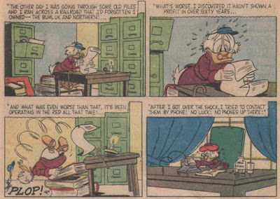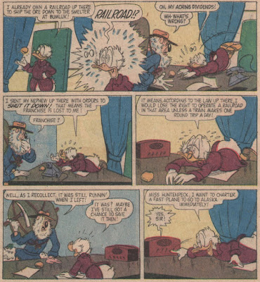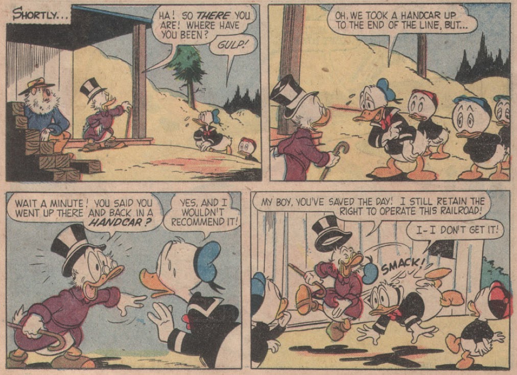 We open with Scrooge strolling in as HDL gorge themselves on jam--as you do. Imagine a full-grown duck etc! You would be able to tell this was written by Carl Fallberg even if inducks didn't tell you so, given the fixation with railroads (in fact, is it possible that the only reason inducks is willing to attribute this to Fallberg is for that reason?). As you may have inferred from subtle little comments I've made here and there, I'm not a fan of the endless Fallberg/Murry MM serials, but Fallberg does okay here (and come to think of it, Murry also worked on a few duck stories that I like--is it just that Mickey presented different challenges that neither of them was quite up to?).