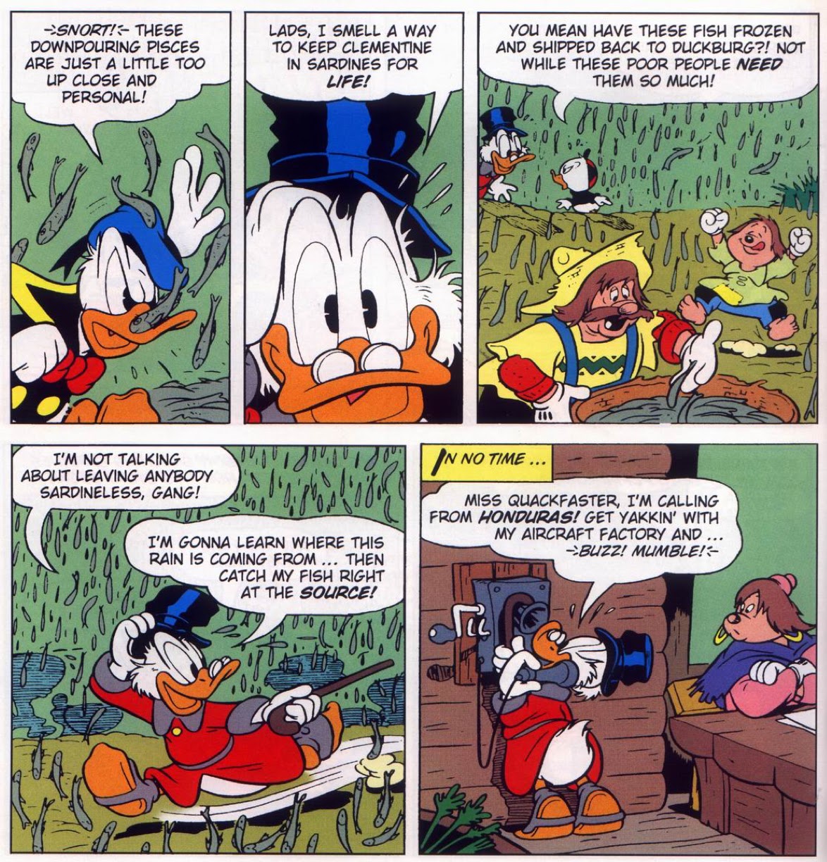 Finally, I totally relate with your bafflement at Scrooge's whispered comment in the second-to-last panel. But it's purely a translation thing! If our French translation is anything to go by, Scrooge's comment in the original is not at all cryptic or adage-like. He just says he was glad that his quest for the dang sardine gave him an occasion to "perform a good deed and help the poor old fellow get some rest".