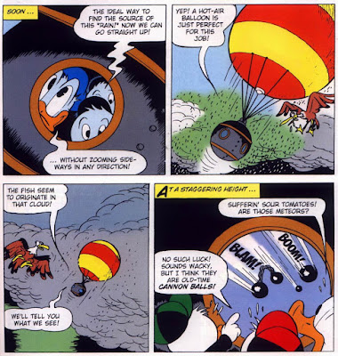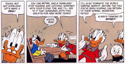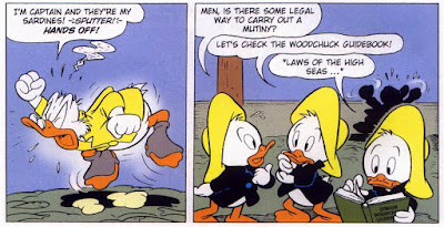 The idea is that Scrooge--savvy customer that he is--wants to keep all these excess fish on board, in spite of the obvious fact that they're all going to rot (and the fact that the ducks are all standing on mounds of dead fish throughout this sequence is never even remarked upon, but it's pretty damned macabre when you think about it). So anyway, this goes on for some time, Donald and the kids lock him up, and it all amounts to nothing in particular.