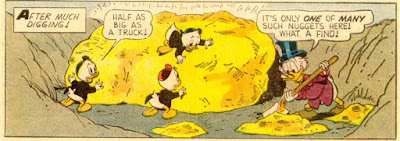 My feeling about this story is that Barks engineered the plot backwards from the ending where a Duckburg street is literally paved with gold. How could that come about? There'd have to be a big load of paving rock and a big load of gold that would get switched....