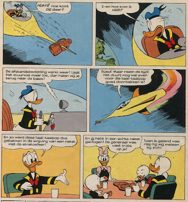 Years later, having read the Weemite story, I bought the Dutch comic you scanned here because I was charmed by the cover, figuring it was just a nod to Barks with an enculturating joke. Then I realized it reflected the fact that they had changed Barks' *dialogue and art* to turn it into a Sinterklaas story! I've seen other instances of the Dutch publishers revamping a Christmas story as a Sinterklaas Day story (e.g. "The Cake House"), but I was pretty surprised to find that done to a Barks story. As Joost points out, it's a story which is not too heavy on the Christmas atmosphere, and accordingly easy to adapt. But I'm a bit dubious about a large *unbaked* Sinterklaas cookie staying intact on the rocket's pointy nose long enough to get baked. Then again, it's not like the original is all that plausible!
