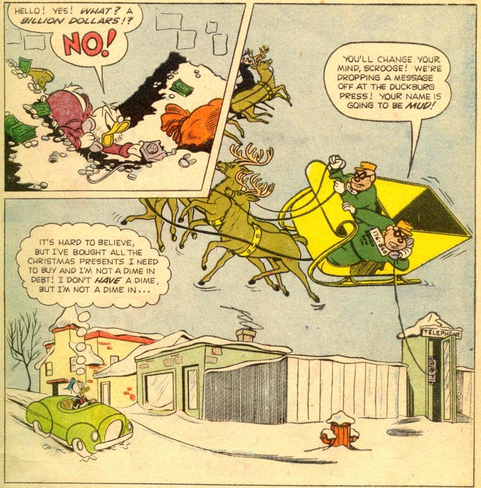 Regardless, I feel like the story fails to mention another sensible reason Scrooge has of not paying: society shouldn't bargain with criminals on their terms. If you start giving a billion dollars to the Beagles because you really want to have a sleighed Christmas, next year they'll be kidnapping the Easter Bunny or holding the Tooth Fairy for ransom and they'll never stop until someone makes a bold move and refuses to pay, whatever the consequences. (There are possible counterarguments to this; but it feels like the most coherent position to take if you want to argue that Scrooge shouldn't pay, and the story's failure to address it is, I think, another major flaw.